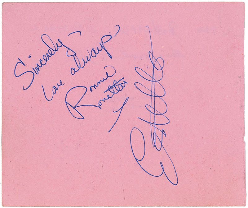Vintage ballpoint signatures, “Sincerely, Love always, Ronnie Ronettes,” “Estelle,” and “Love, Nedra Ronettes,” on two 4.5 x 3.75 album pages. In fine condition.