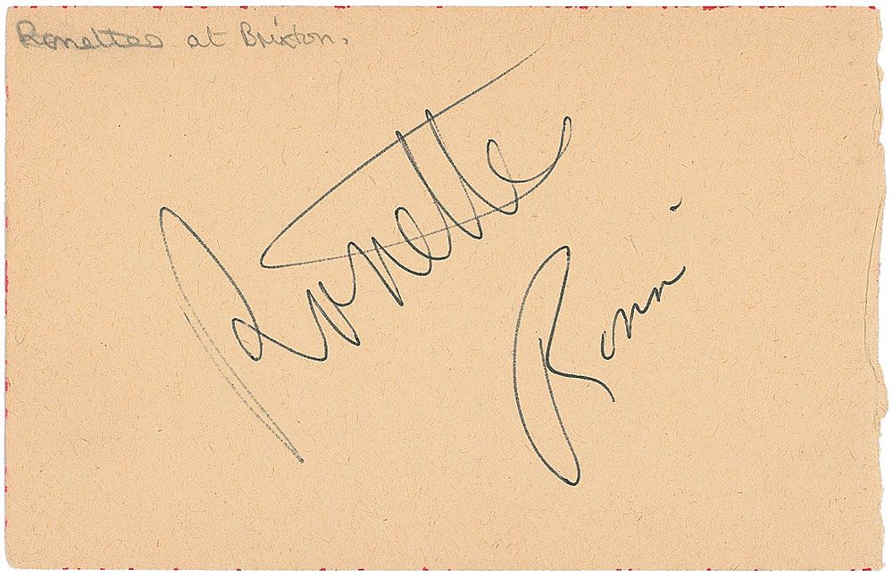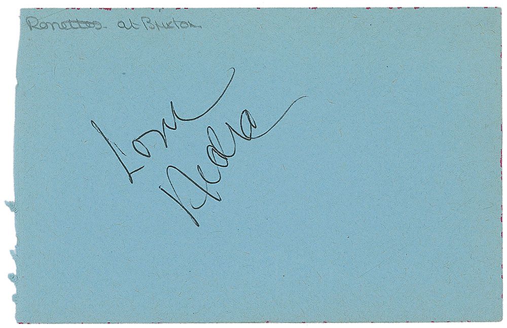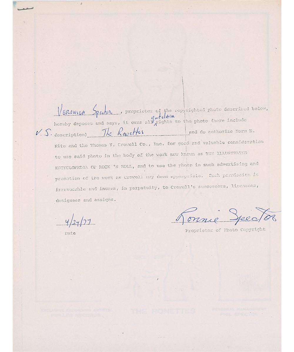 Three items: DS, signed “Ronnie Spector,” two pages, April 24, 1977. Document gives permission for the attached photo of the Ronettes to be used in The Illustrated Encyclopedia of Rock and Roll, signed at the conclusion by Spector; and vintage ballpoint signatures, “Ronettes Ronni,” and “Love, Nedra,” on individual 4.75 x 3 album pages. In fine condition. Accompanied by a full letter of authenticity from Roger Epperson/REAL for the document.