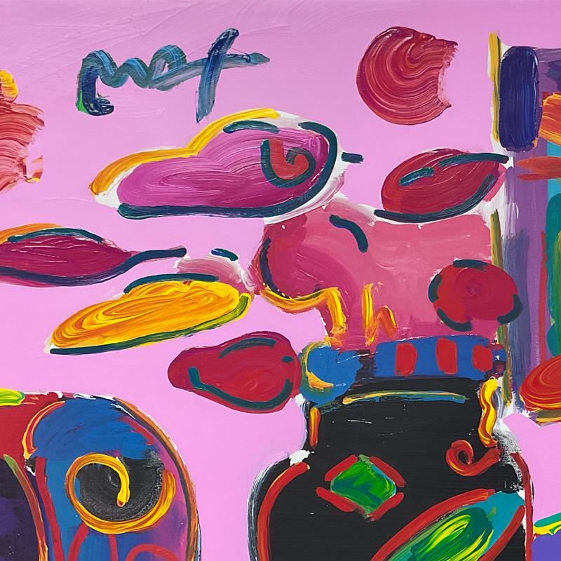 "The Room" is a one-of-a-kind acrylic mixed media on paper, hand signed by Peter Max. On the reverse side of this piece there is a registration number from Peter Max Studios certifying authenticity. This piece comes custom framed. Measures approx. 30" x 42" (frame), 24" x 36" (image).