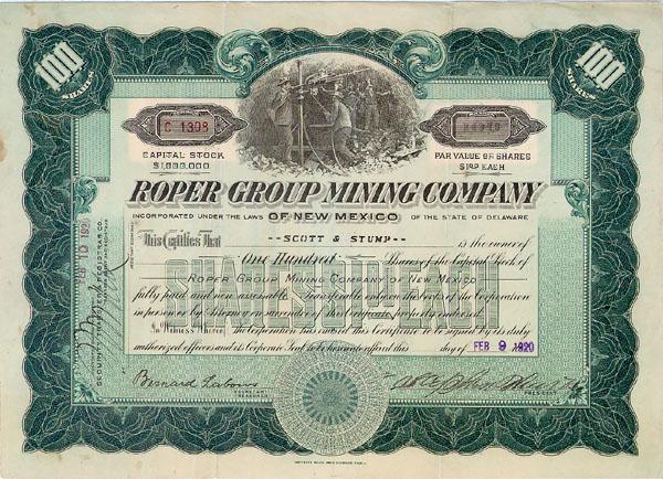 1920, New Mexico. Stock Certificate for 100 shares. Green and black on white paper. Top center vignette of miners working in a mine. Uncancelled and fine.