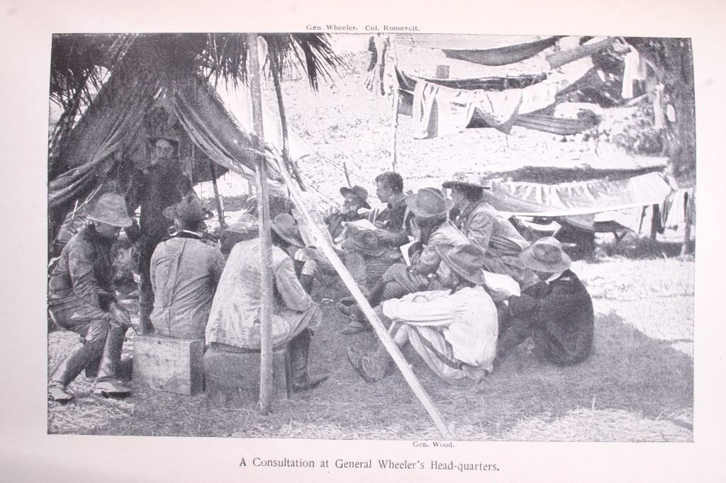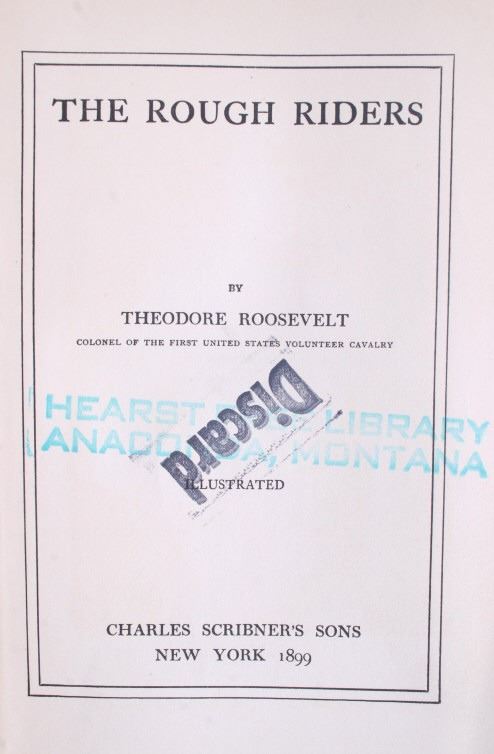 For your consideration is The Rough Riders by Theodore Roosevelt first edition circa 1899. This book gives a detailed account of Teddy Roosevelt and the role his Rough Riders played in Cuba when he famously charge San Juan Hill. This first edition book was published by Charles Scbribner's Sons in 1899. The book has the original green cloth cover but the binding has been redone as it seen a lot of use during its tenure in the Hearst Free Library in Anaconda, MT. The book is in fair condition and measures 8 1/2" x 5 1/2".