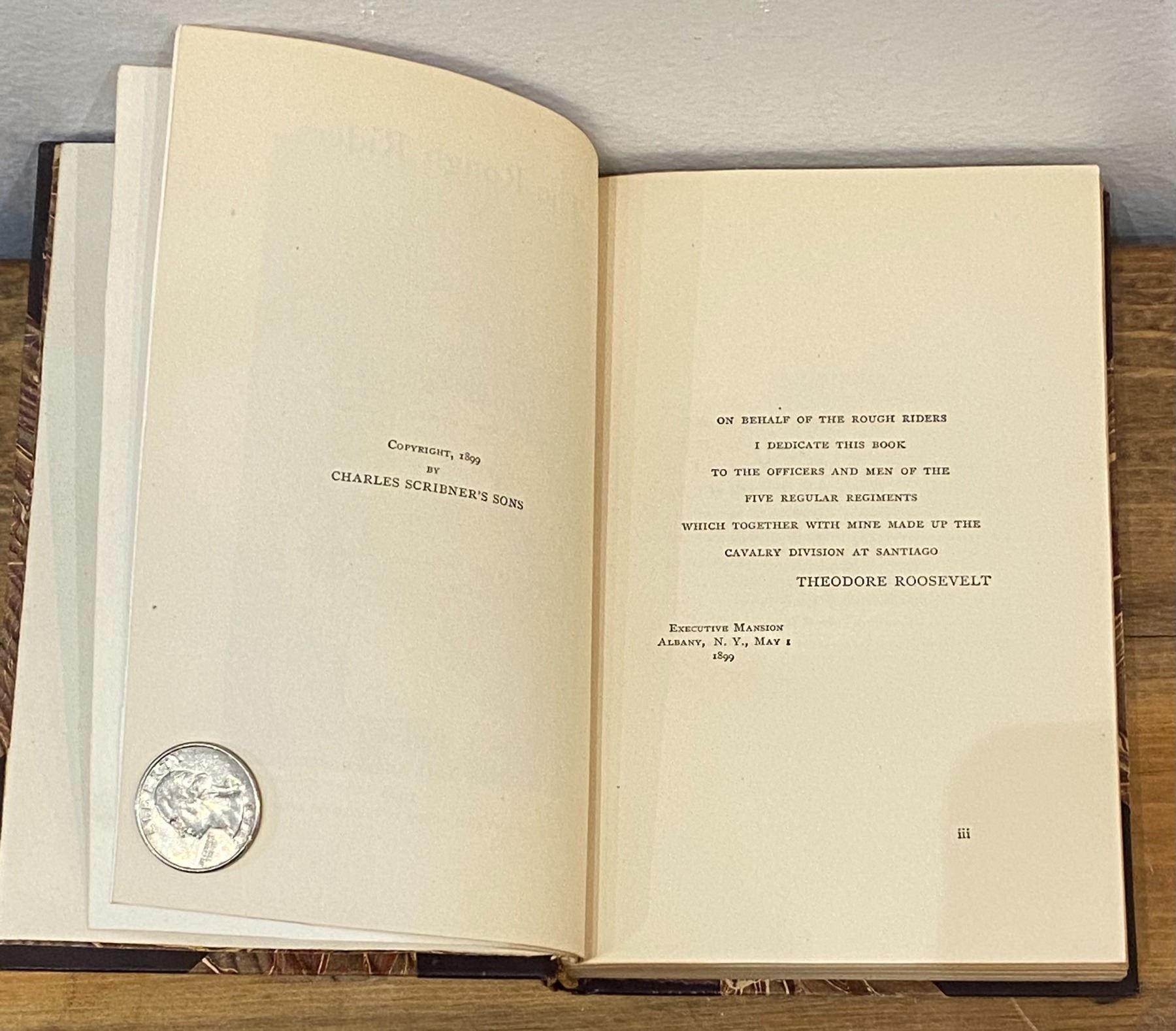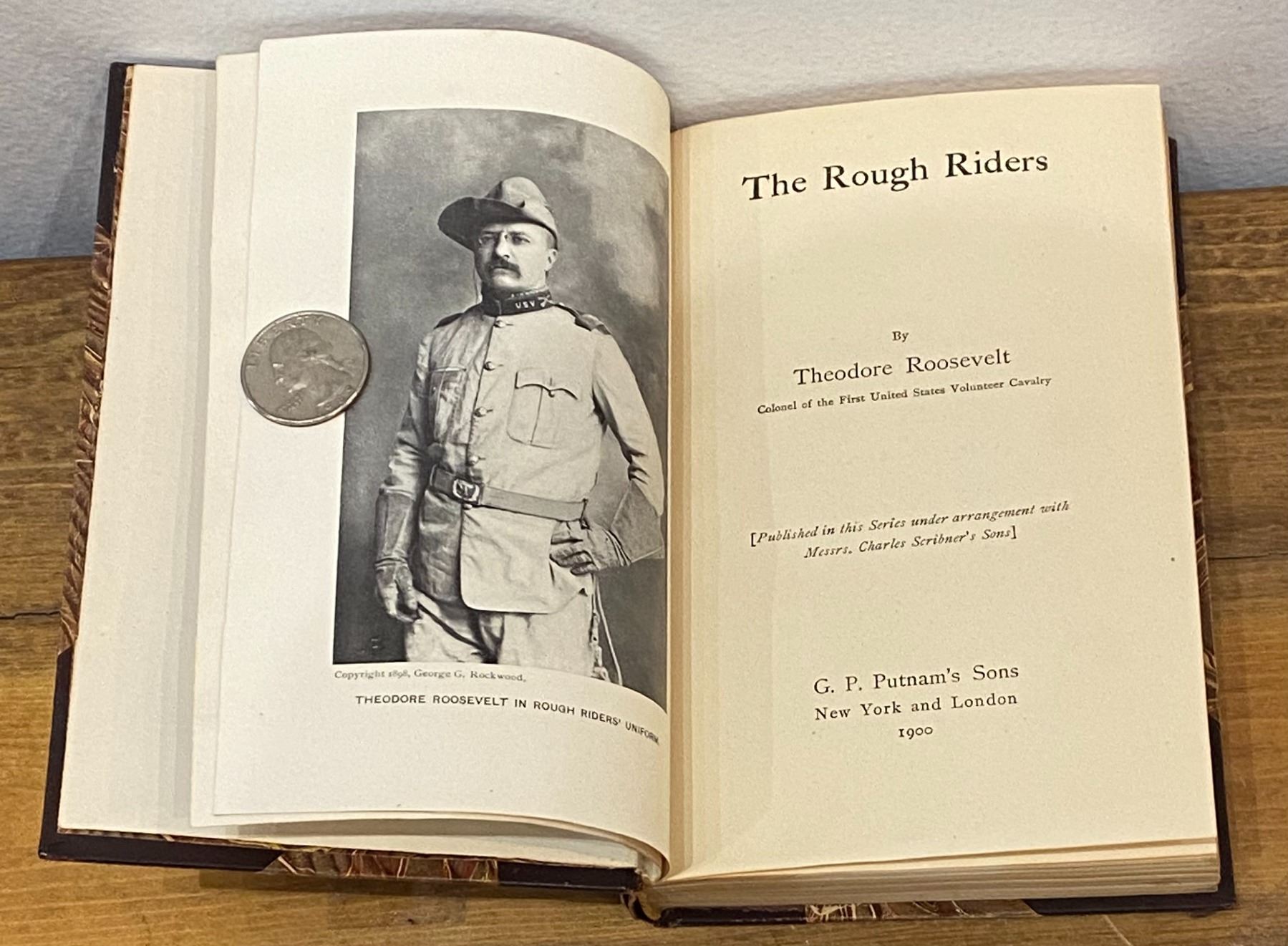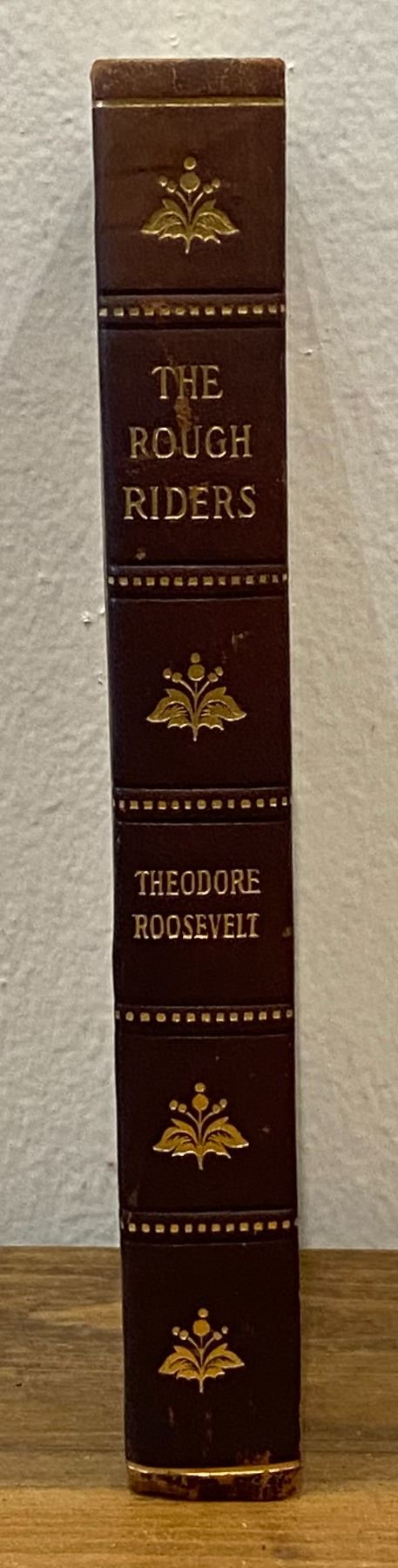 This Lot is The Rough Riders by Theodore Roosevelt. Small octavo, bound in three quarters Morocco, gilt top edge, raised bands, gilt titles and tooling to the spine, marbled endpapers.