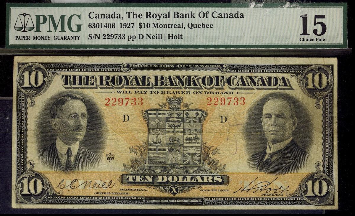 The Royal Bak of Canada 1927 $10 S/N 229733 pp D Neil, Holt PMG F15