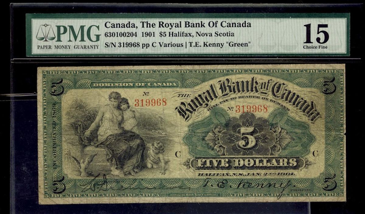 The Royal Bank of Canada 1901 $5 #319968 CH-630-10-02-04 PMG CH F15. Only 7 known. Very rare.