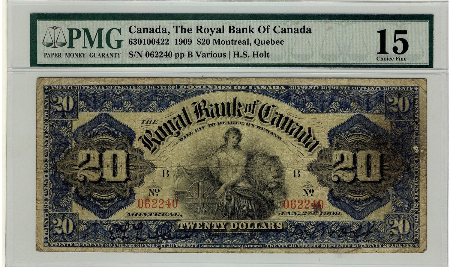 The Royal Bank of Canada 1909 $20 #062240 CH-630-10-04-22 PMG CH F15. Only 9 known. Rare!