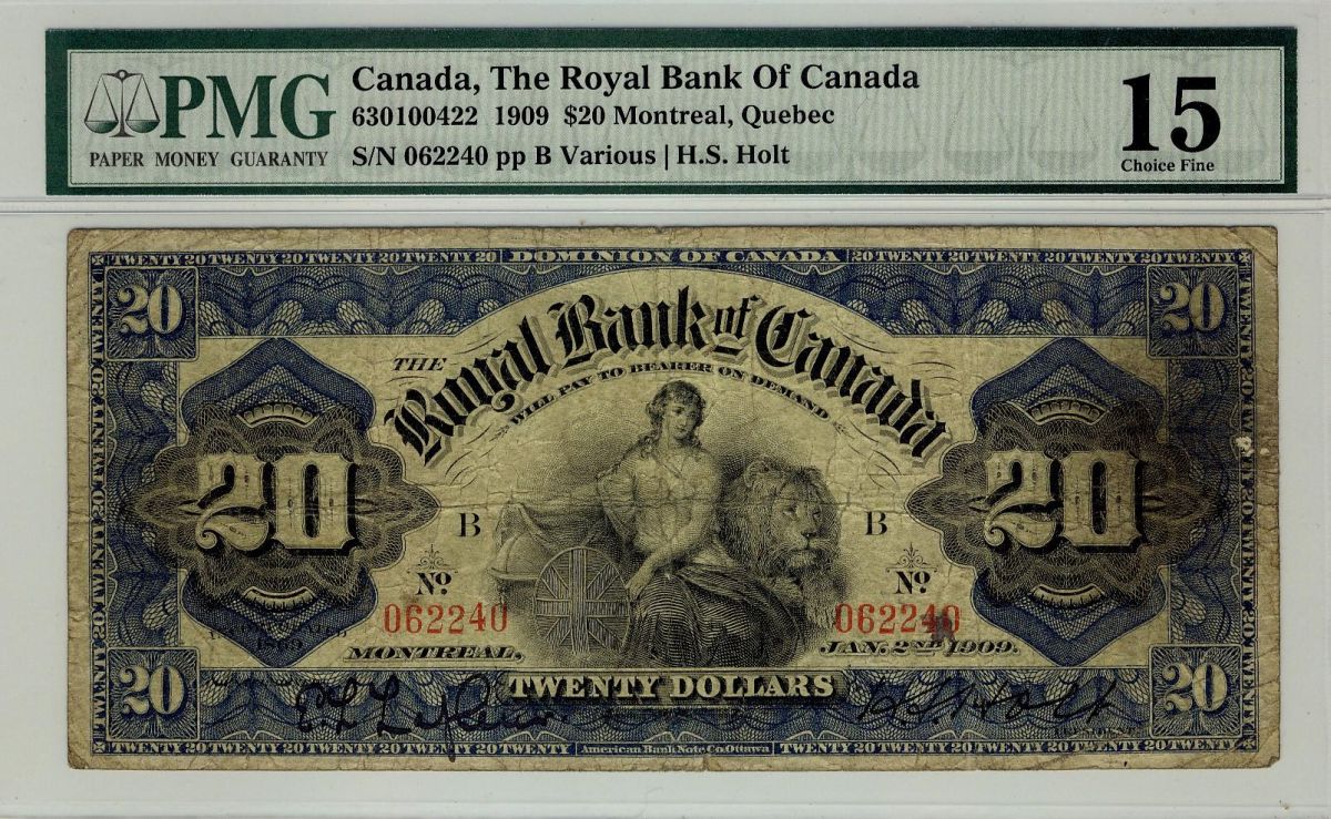 The Royal Bank of Canada 1909 $20 #062240 CH-630-10-04-22 PMG CH F15. Only 9 known. Rare!