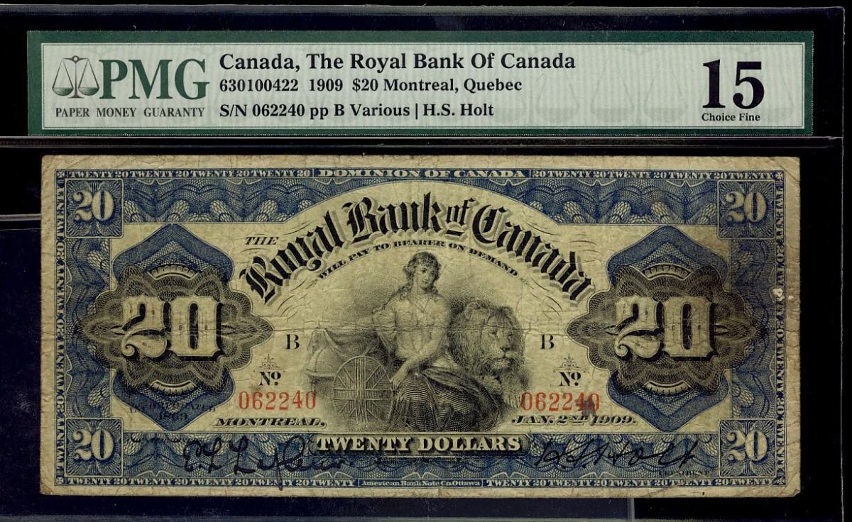 The Royal Bank of Canada 1909 $20 #062240 CH-630-10-04-22 PMG CH F15. Only 9 known. Rare!