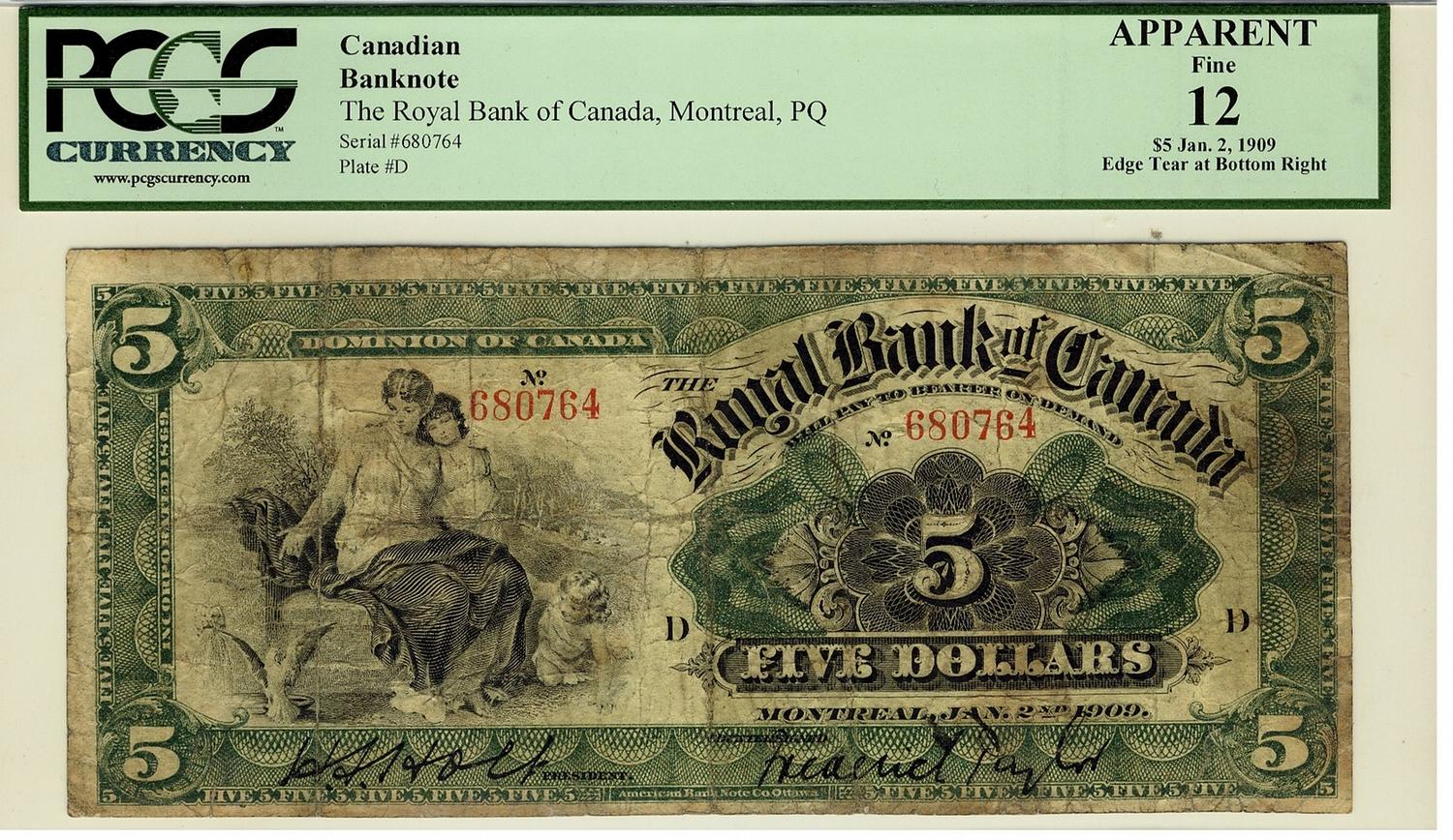 The Royal Bank of Canada, 1909 $5 #680764, CH-630-10-04-06, PCGS APPARENT F12. Green, Holt sign., only 23 known.