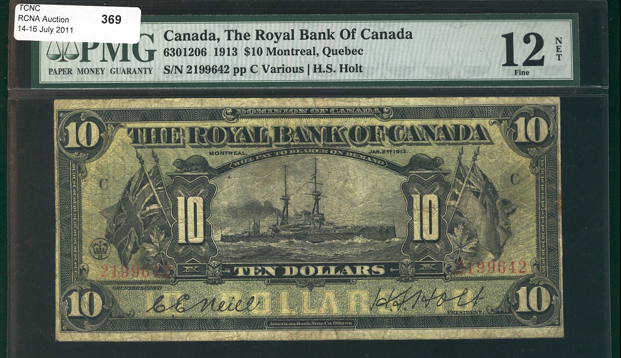 The Royal Bank of Canada 1913 $10 2199642, CH-630-12-08. PMG F12, comment Trimmed.