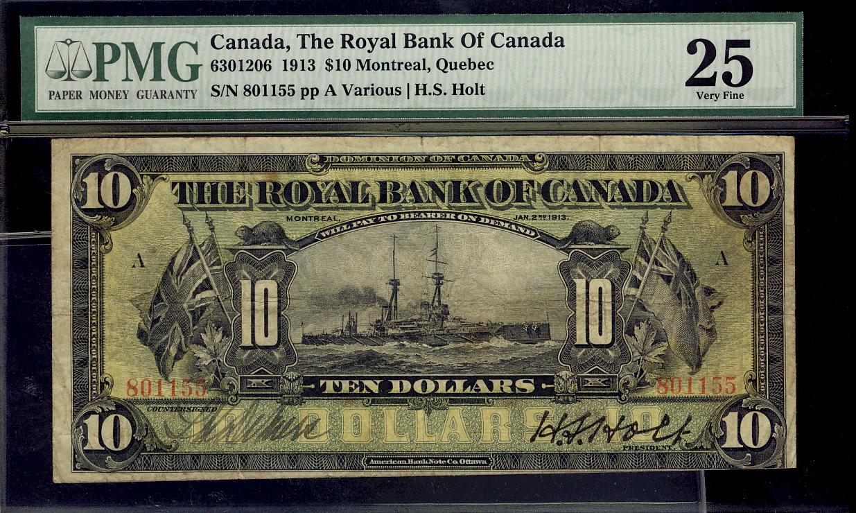 The Royal Bank of Canada 1913 $10 #801155 CH-630-12-06 PMG VF25. Ms. Sign, Scarce type.