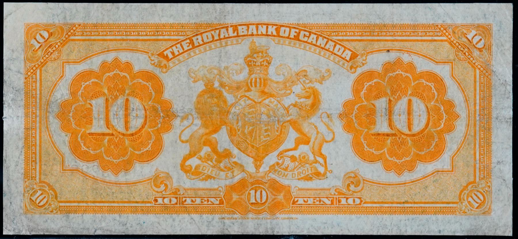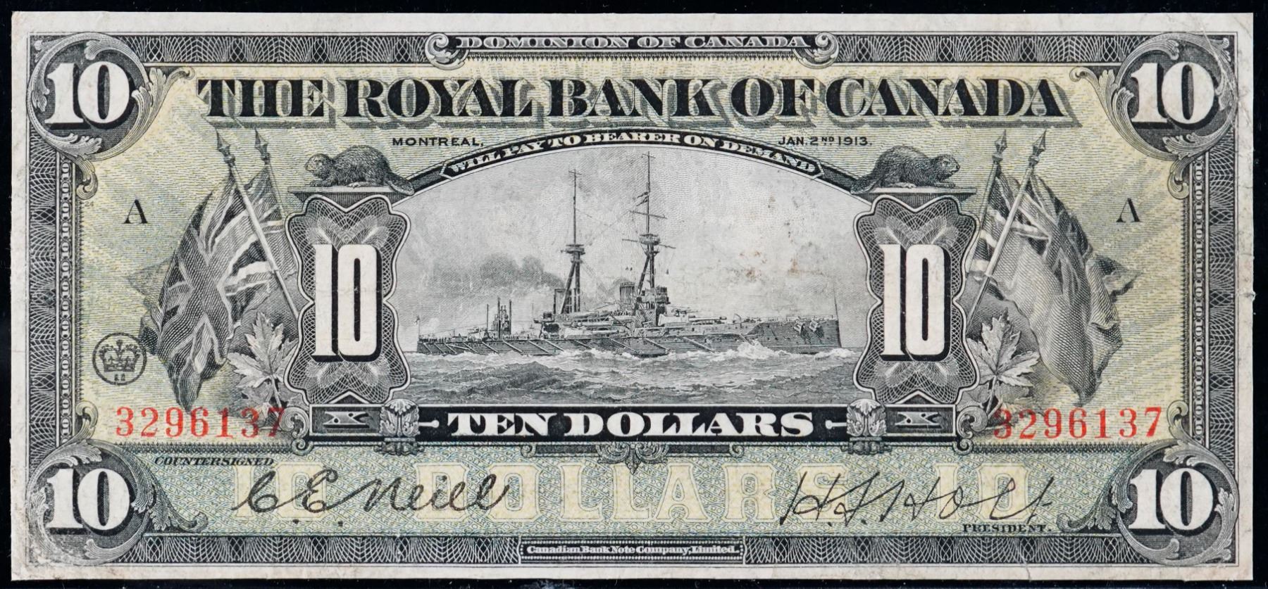 The Royal Bank of Canada 1913 $10 CH-630-12-08 "Battleship" A VF example.