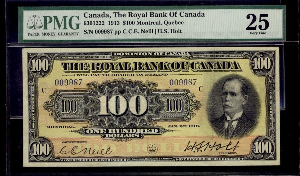 The Royal Bank of Canada 1913 $100 #009987 CH-630-12-22 PMG VF25. Excessively scarce.