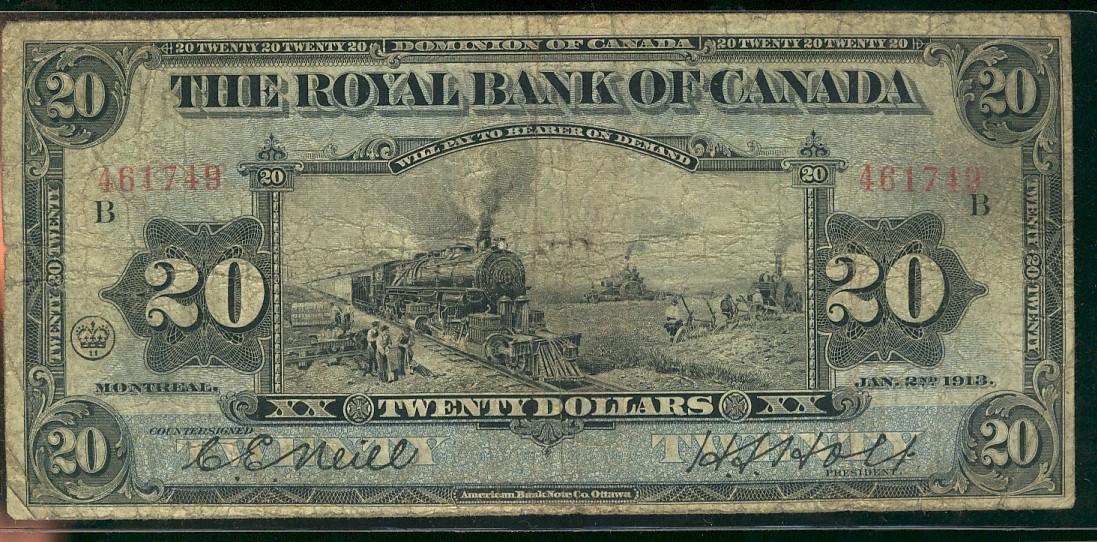 The Royal Bank of Canada 1913 $20 #461749 CH-630-12-12. Note grades VG.
