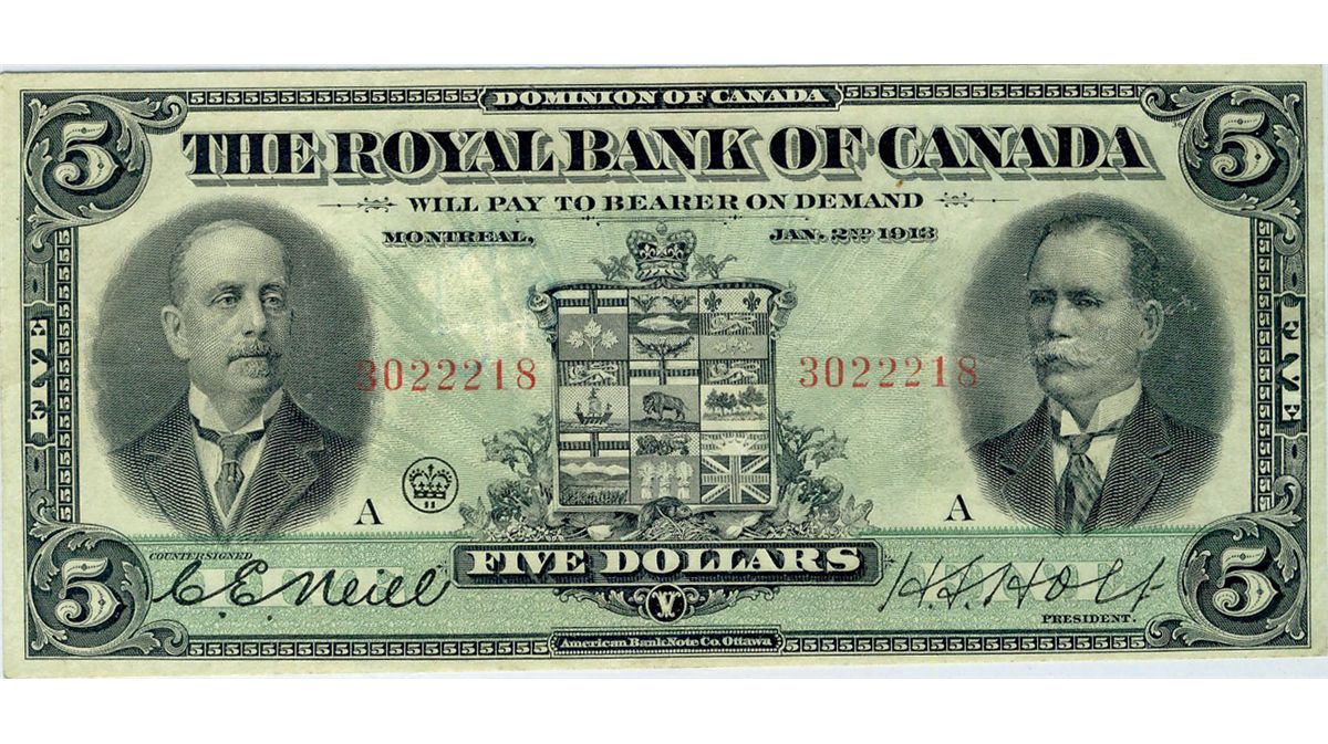 The Royal Bank of Canada; 1913 $5 #3022218 CH-630-12-04 PMG VF35. Bright strong colours, nice for grade.