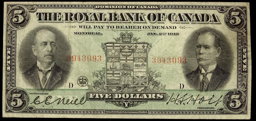The Royal Bank of Canada 1913 $5 #3943093, CH-630-12-04. VF in grade.