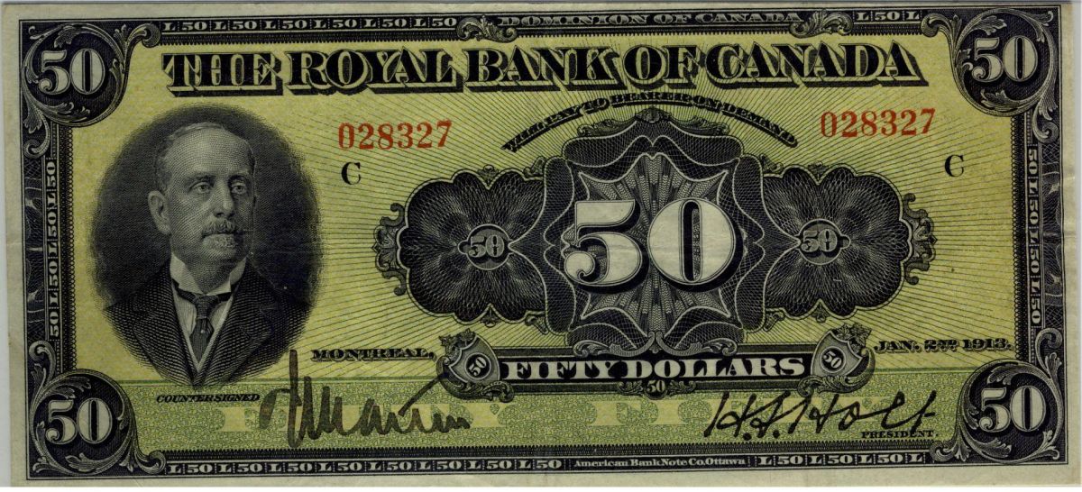 The Royal Bank of Canada 1913 $50 #028327 CH-630-12-16 PMG VF30. Only 2 known.. Believed to be the finest known. Excessively RARE.