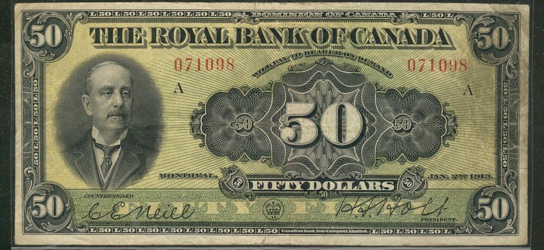 The Royal Bank of Canada 1913 $50 #071098 CH-630-12-12. Fine/VF for grade with a couple minor rim tears. Should be viewed.