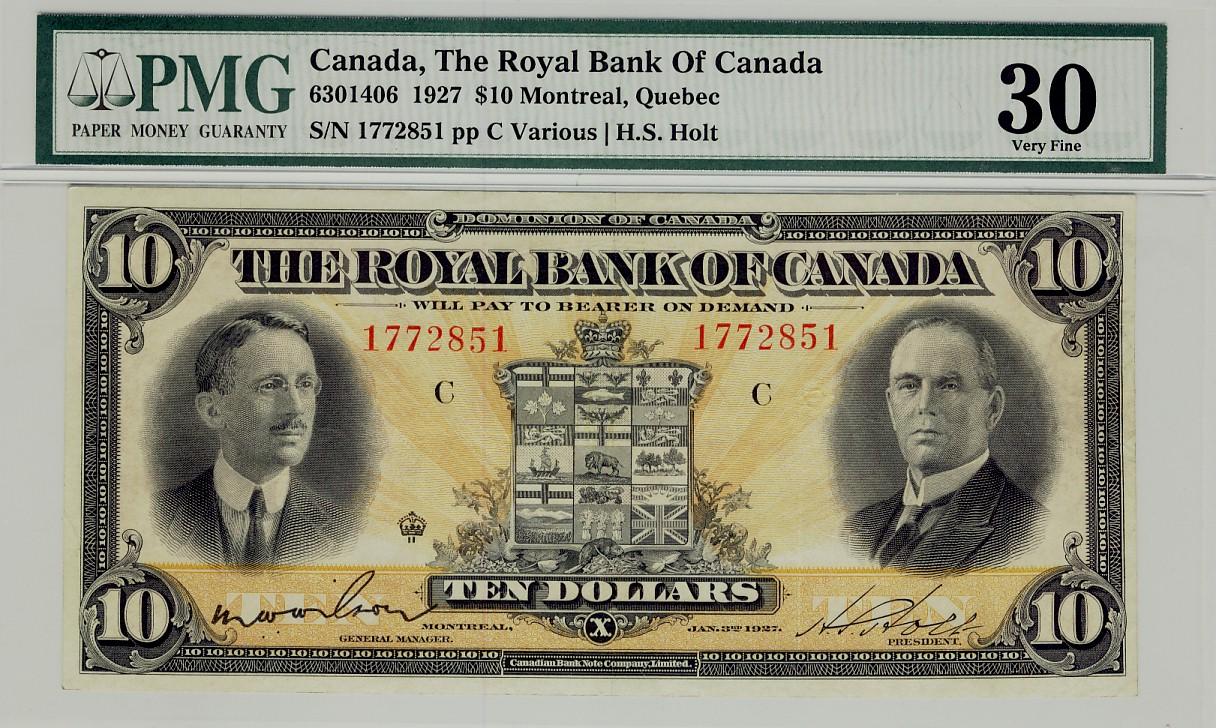 The Royal Bank of Canada 1927 $10 #1772851 CH-630-14-06. Solid PMG VF30.