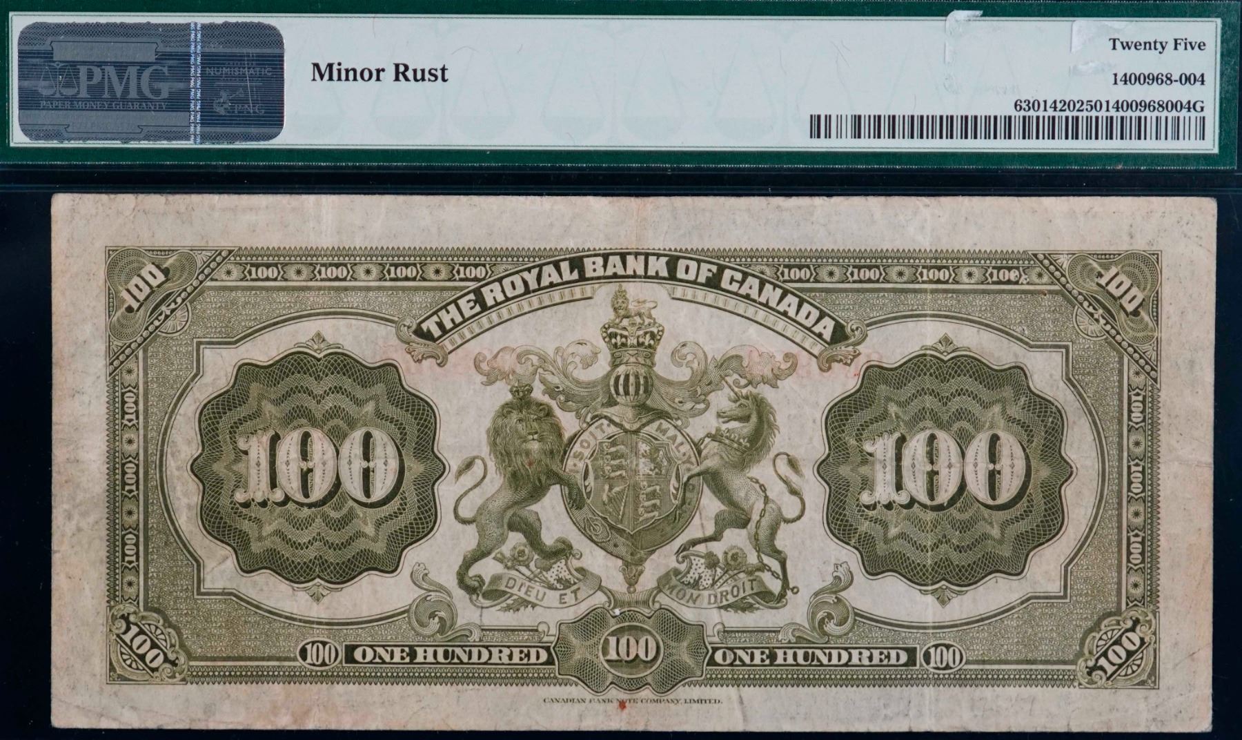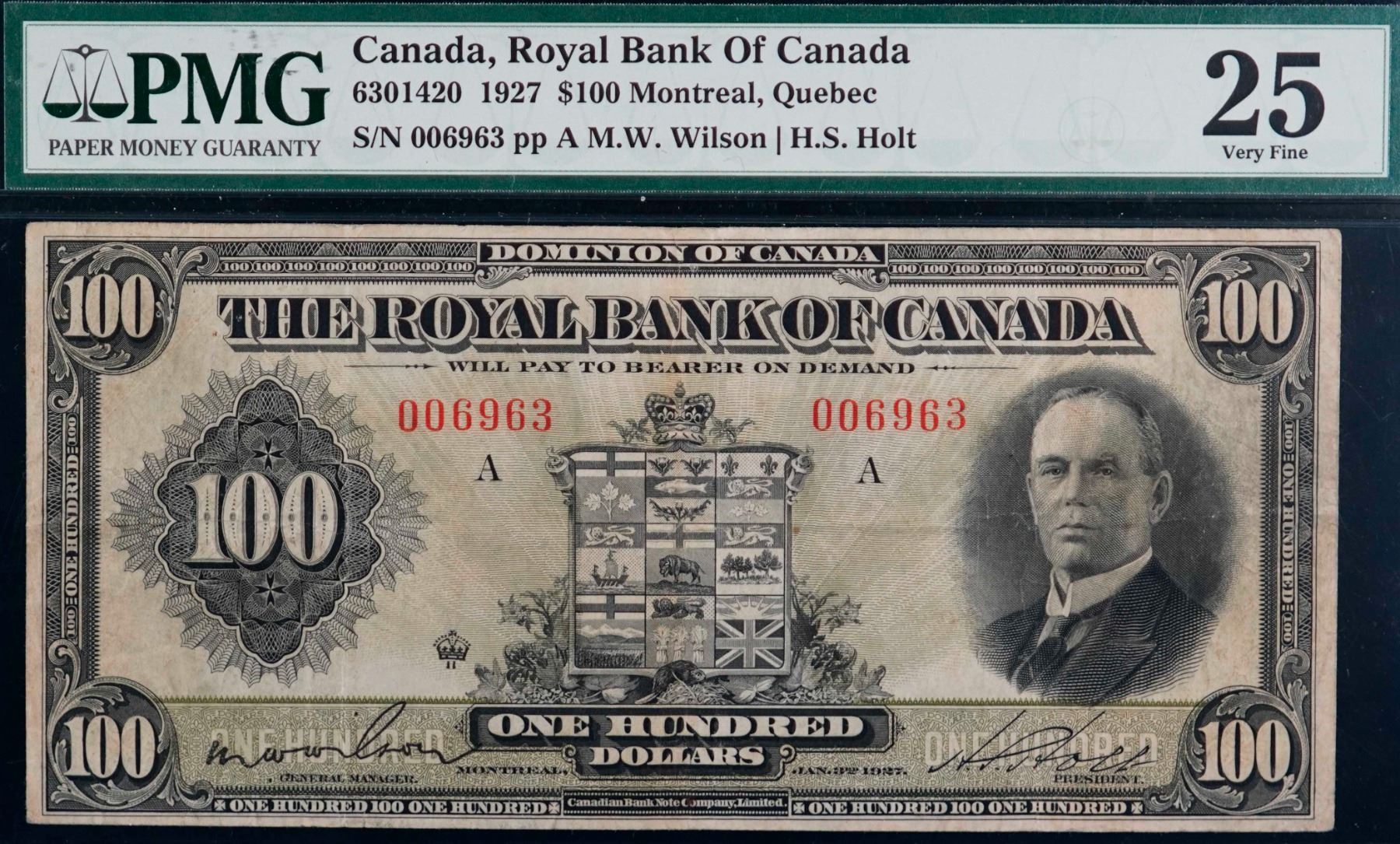 The Royal Bank of Canada 1927 $100 CH-630-14-20 #006963 PMG Choice Very Fine-25. A bright example with nice colours.