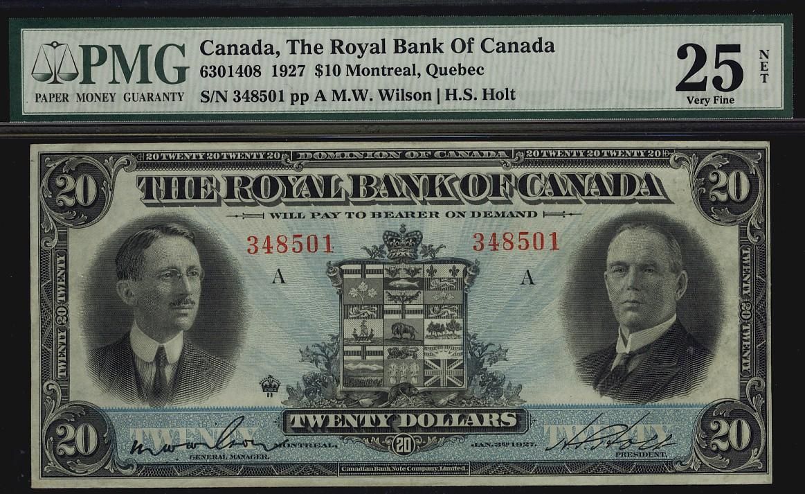 The Royal Bank of Canada 1927 $20 #348501, CH-630-14-12 PMG VF25. Mention of Trim, difficult to make out. Holder title is in error.