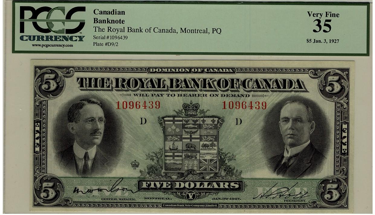 The Royal Bank of Canada 1927 $5 1096439 CH-630-14-04 PCGS VF35