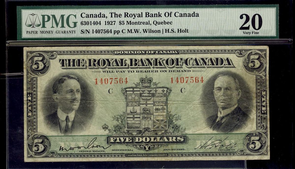 The Royal Bank of Canada 1927 $5 #1407564 CH-630-14-04 PMG VF20.