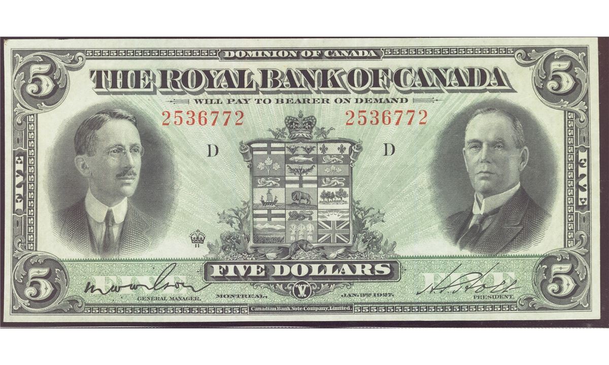 The Royal Bank of Canada 1927 $5 #2536772, CH-630-14-04, PMG AU55.