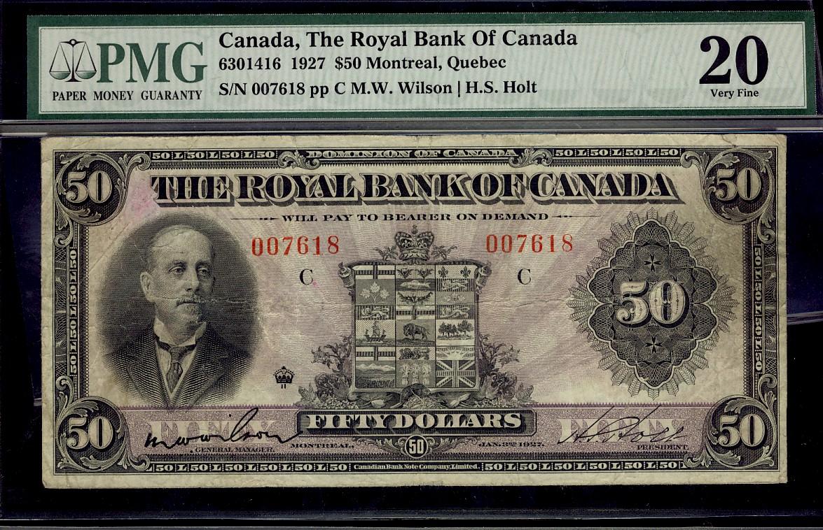 The Royal Bank of Canada 1927 $50 #007618 CH-630-14-16 PMG VF20.