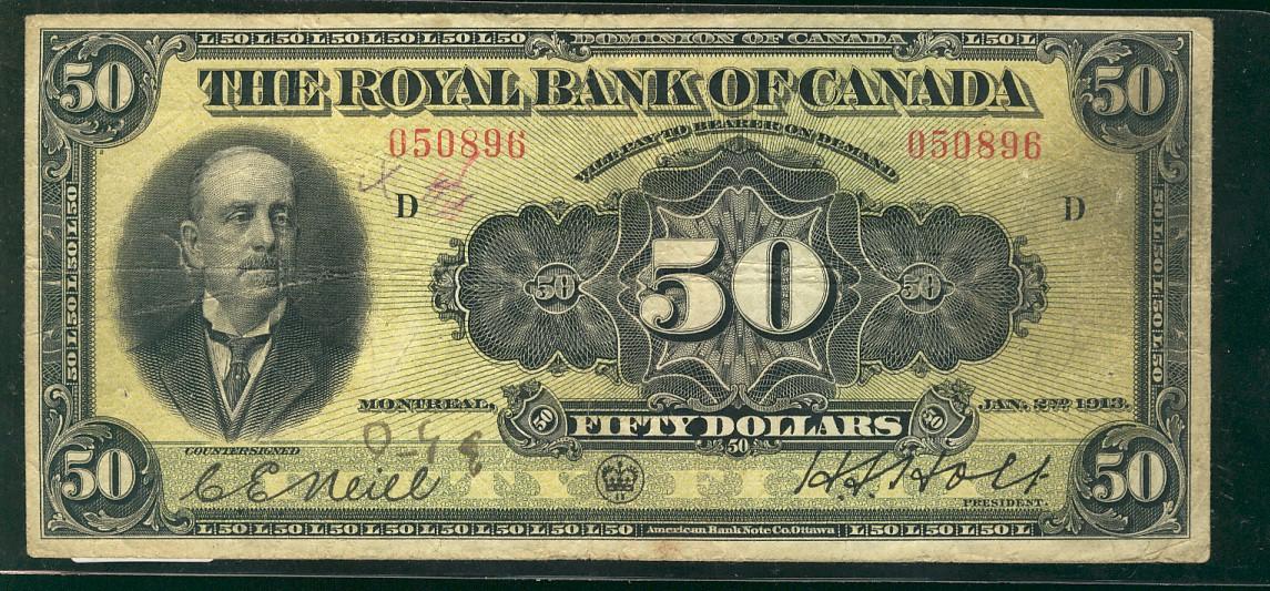 The Royal Bank of Canada 1927 $50 #015855 CH-630-14-16. A nice Fine for grade with right bottom corner missing and light center rim tear. Should be viewed.