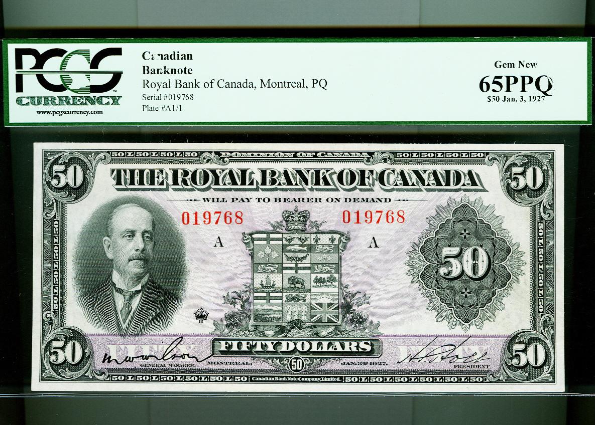 The Royal Bank of Canada 1927 $50 #019768 CH-630-14-16, PCGS UNC 65 PPQ. Well centered, bright with full embossing. An unbelievable example in Gem condition. A true rarity. Despite all catalogues, worth a premium bid.