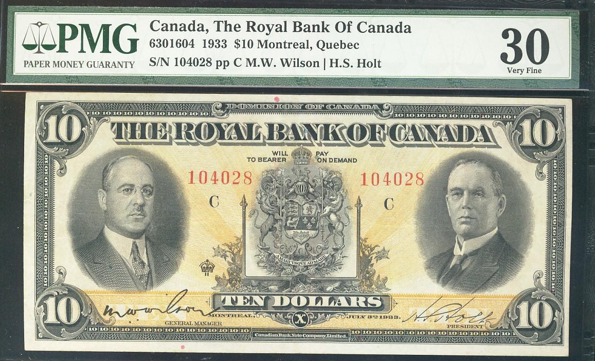 The Royal Bank of Canada 1933 $10 No.104028 PMG VF30, clean and choice
