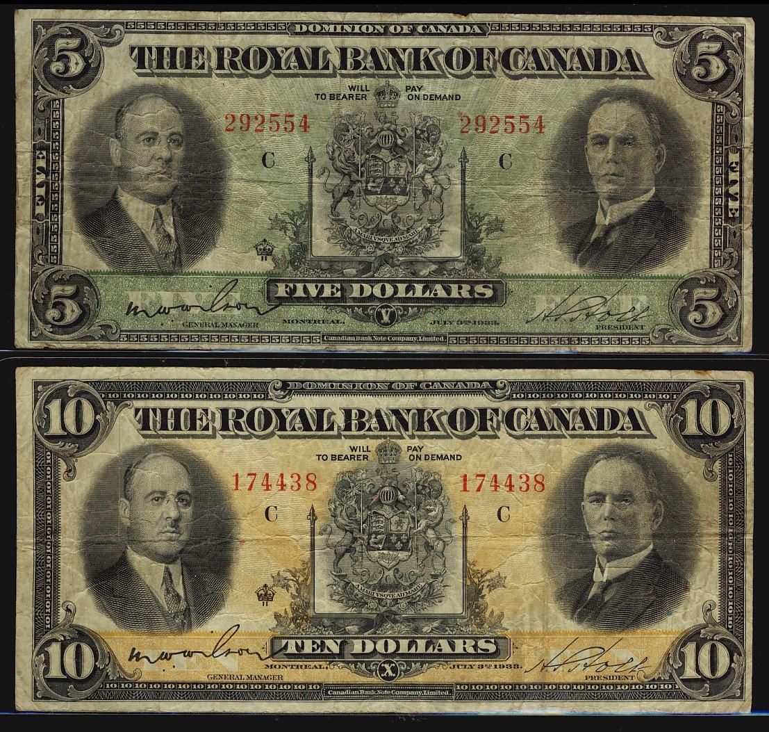 The Royal Bank of Canada 1933 $5 & $10 CH-630-16-02 and 16-04. Lot of two notes Fine to VF. #292554 and #174438.