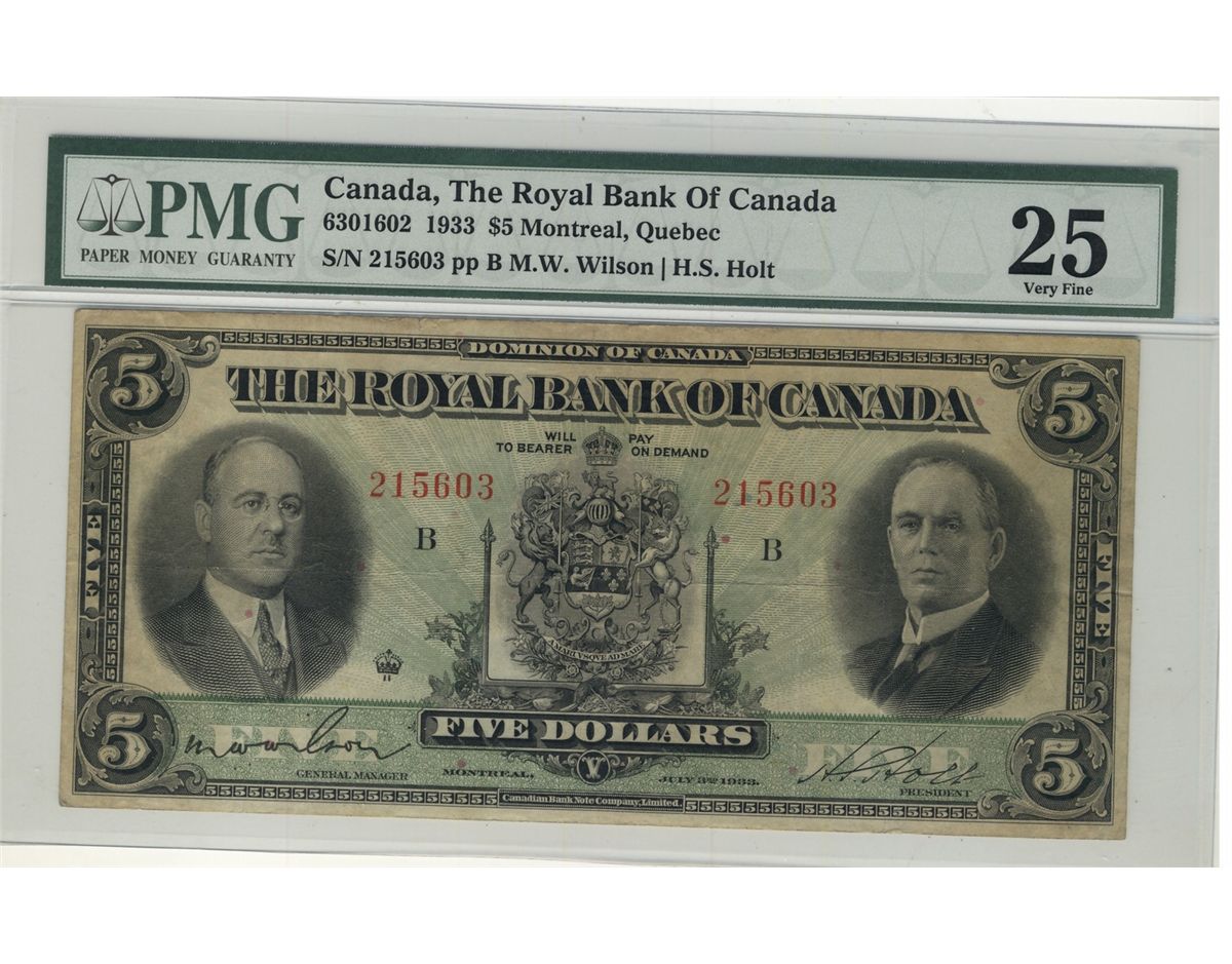 The Royal Bank of Canada; 1933 $5 #215603 CH-630-16-02 PMG VF25.