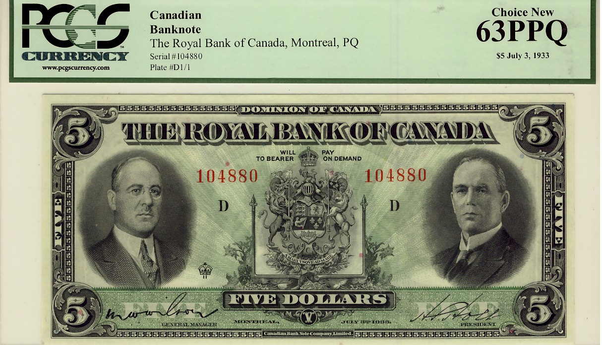 The Royal Bank of Canada 1933 $5 CH-630-16-04 S/N 104880 PCGS UNC63PPQ. Rare issue in this choice condition. Worth a premium bid.