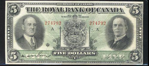 The Royal Bank of Canada 1933 $5 CH630-16-04 No.274792 VF+. Issues of 1933 are very difficult to find. Scarce and underrated.