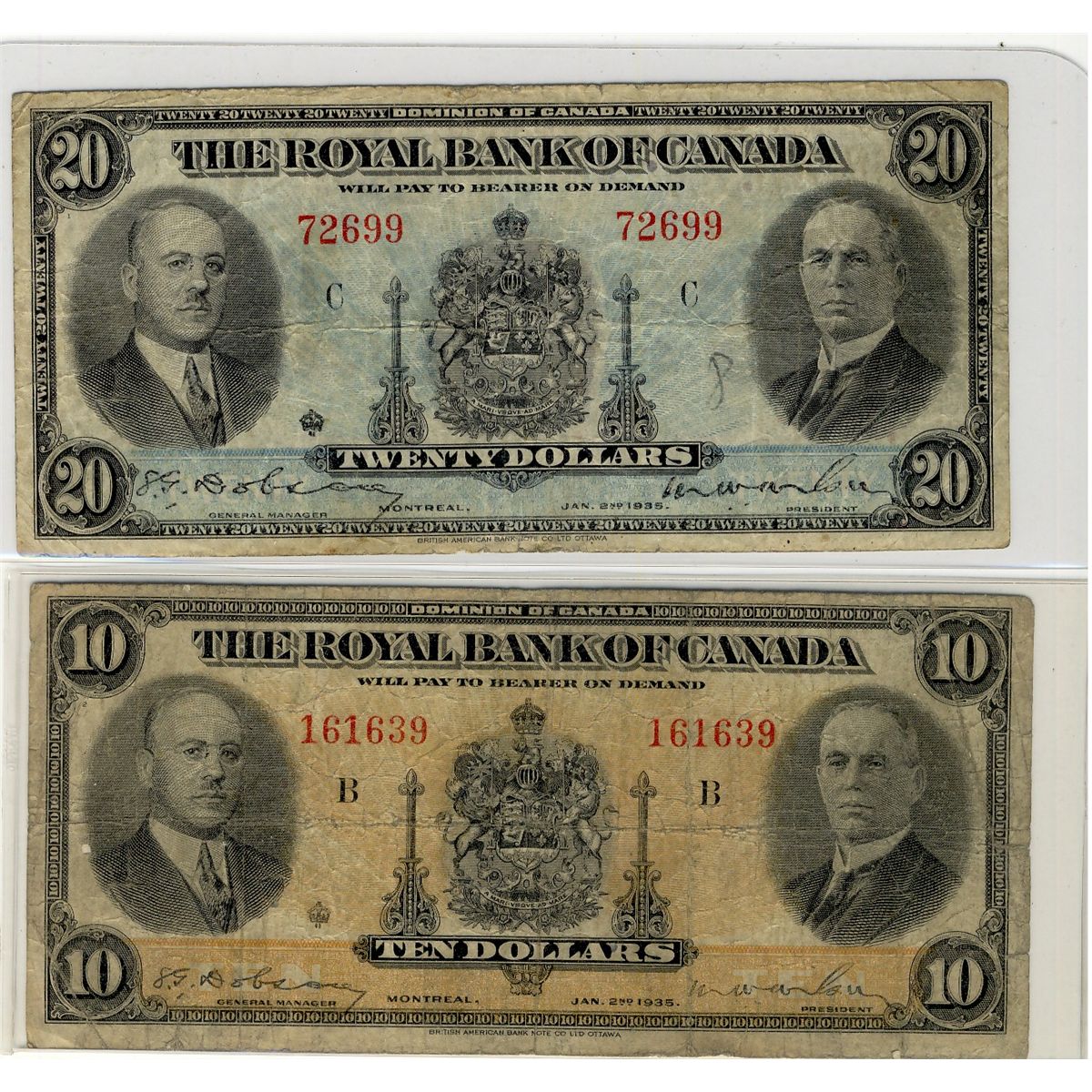 The Royal Bank of Canada 1935 $10 CH-630-18-04 & $20 CH-630-18-06a. Lot of 2 notes VG to Fine.