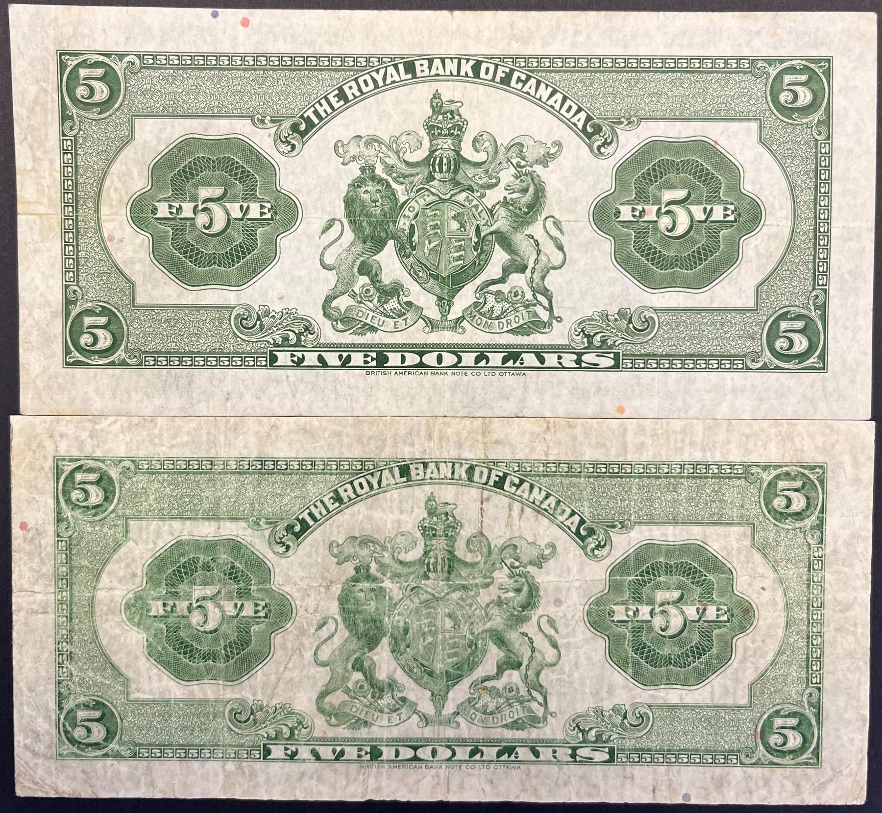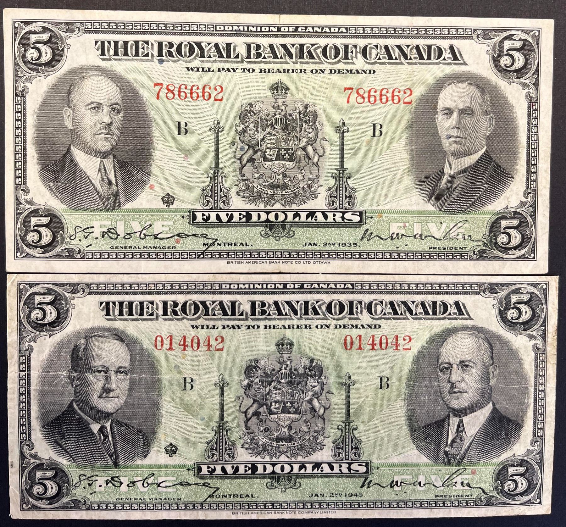 The Royal Bank of Canada 1935 & 1943 $5's, lot of 2 notes F to VF.