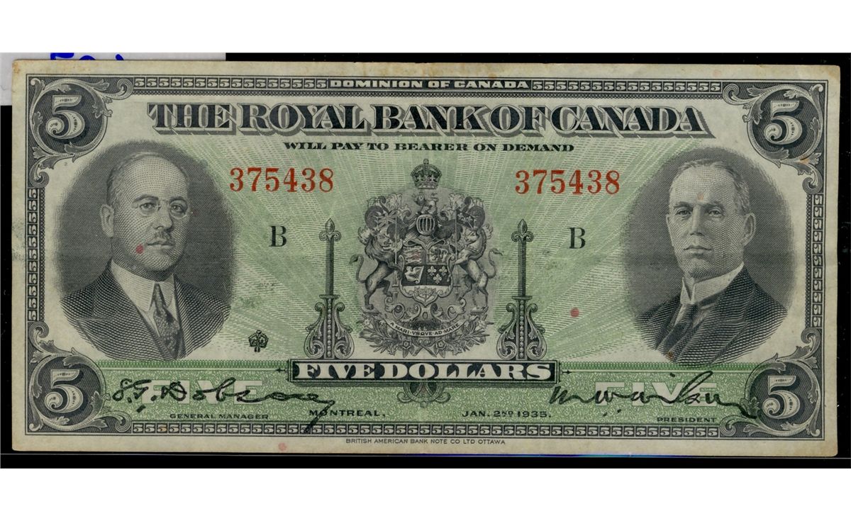 The Royal Bank of Canada; 1935 $5 #375438 CH- 630-18-02a, Large Signatures in VF+ Condition