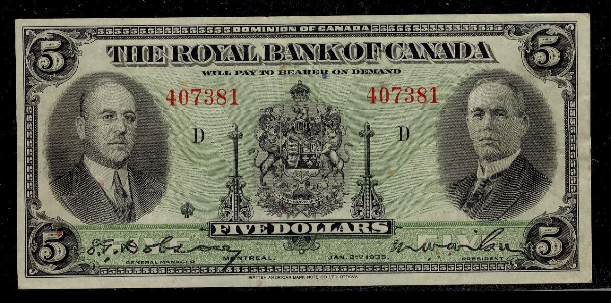 The Royal Bank of Canada 1935 $5 #407381 CH-630-18-02a. Clean and bright VF-EF.