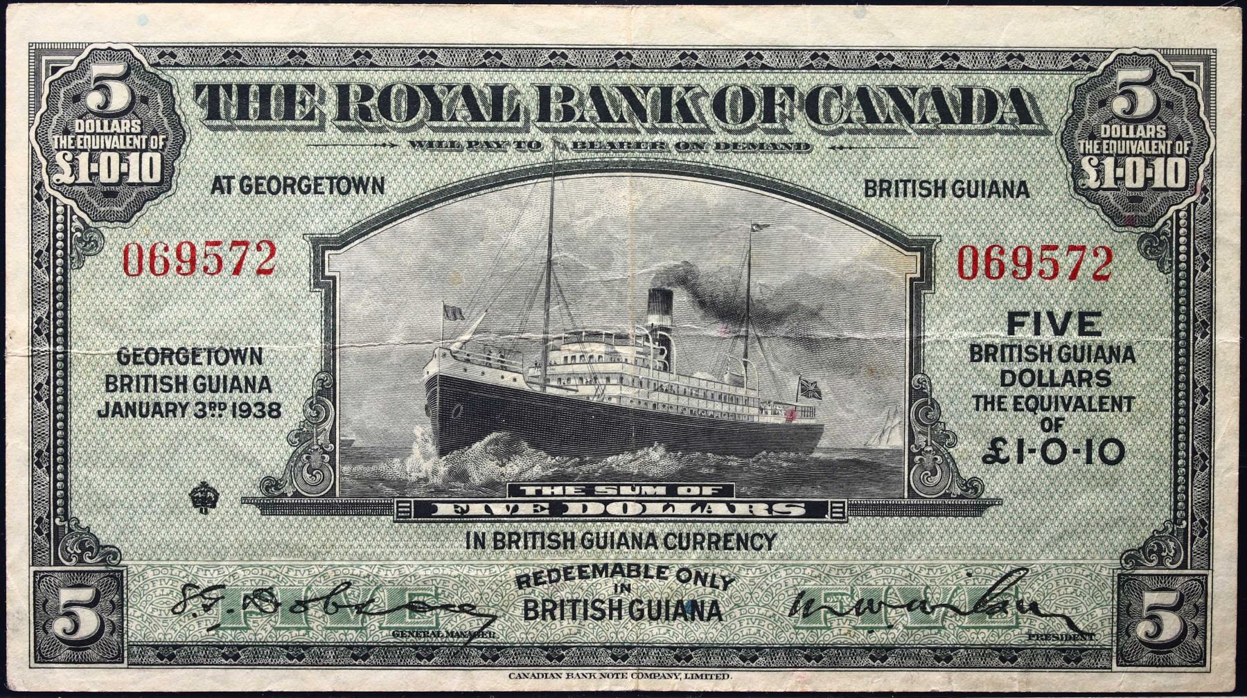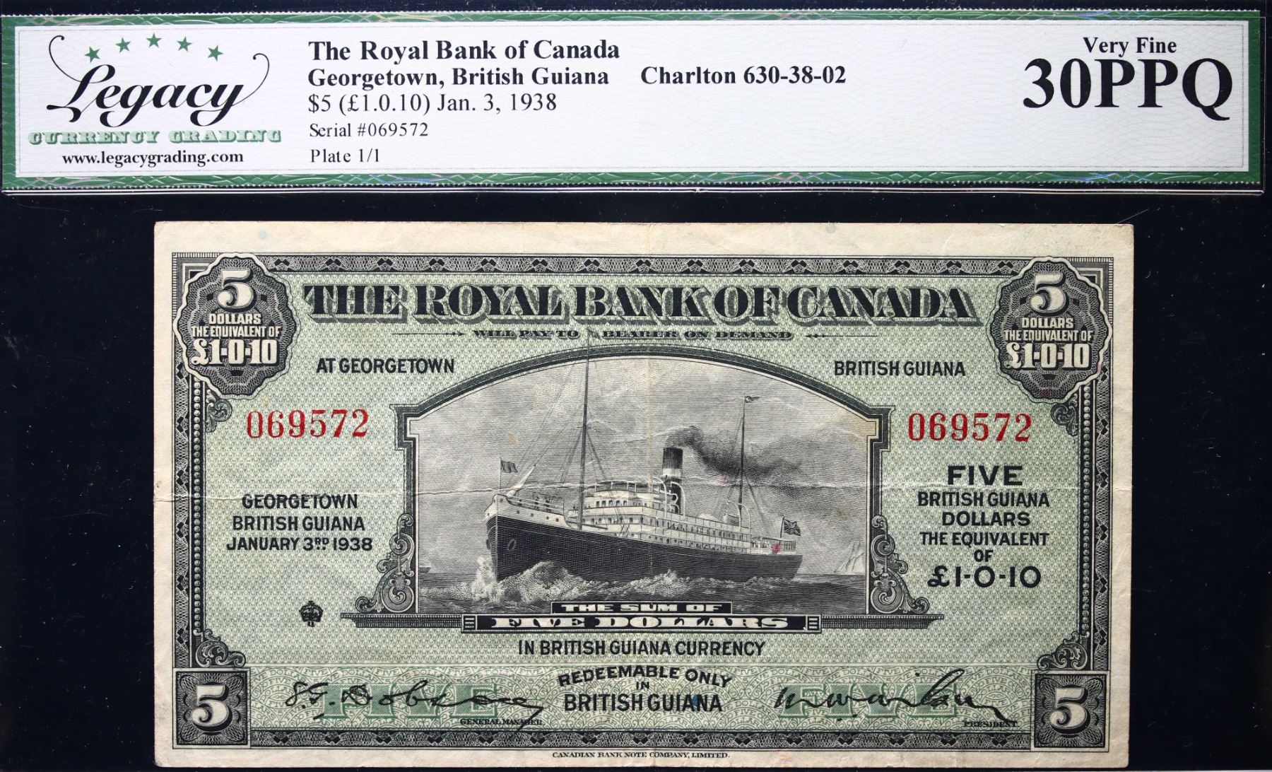 The Royal Bank of Canada 1938 $5 CH-630-30-02 'BARBADOS' #037923 LCG Choice Very Fine-25. Scarce issue.
