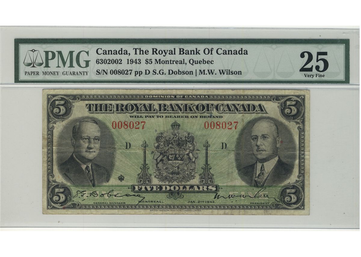 The Royal Bank of Canada; 1943 $5 #008027 CH-630-20-02 PMG VF25.