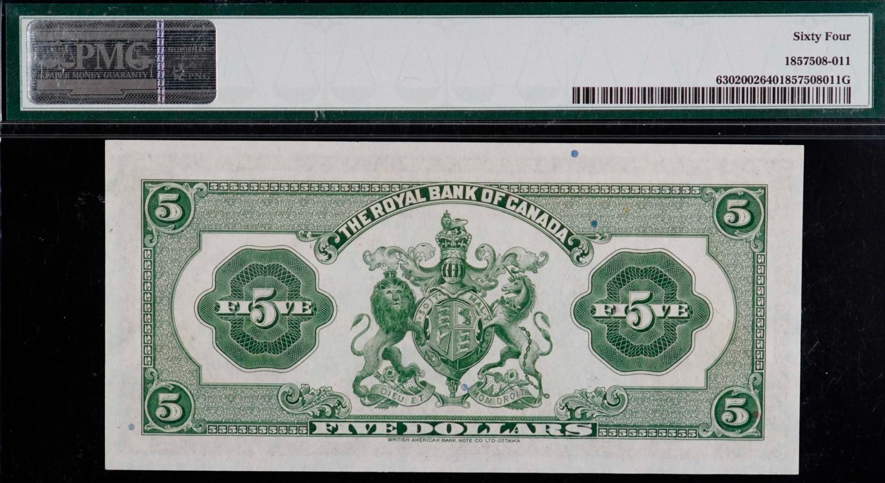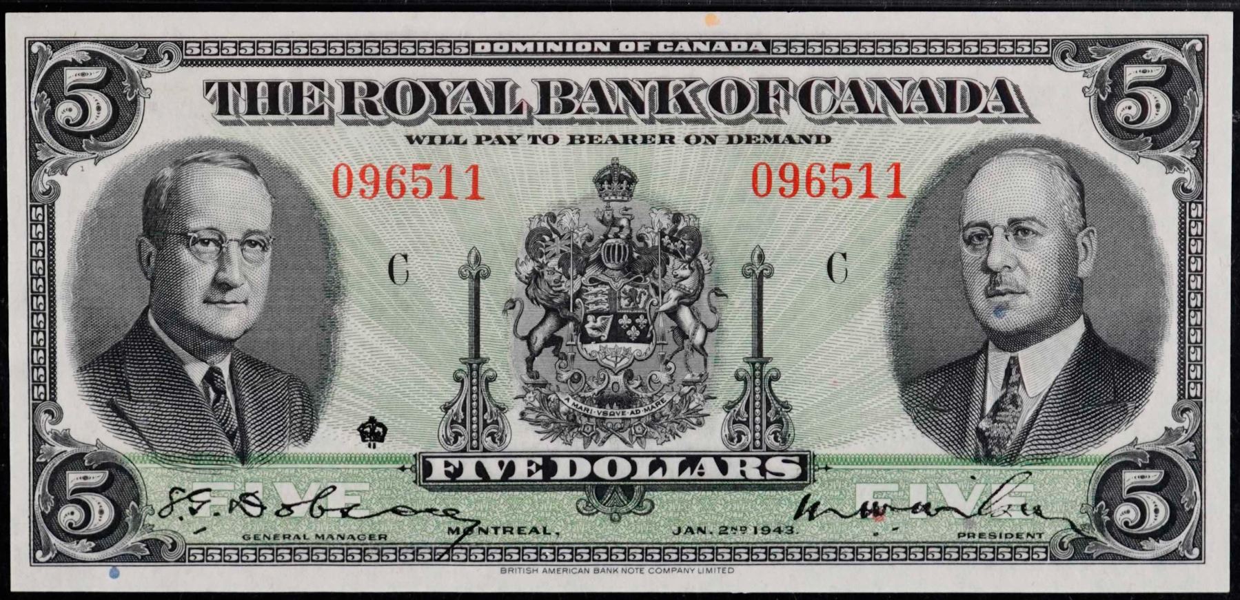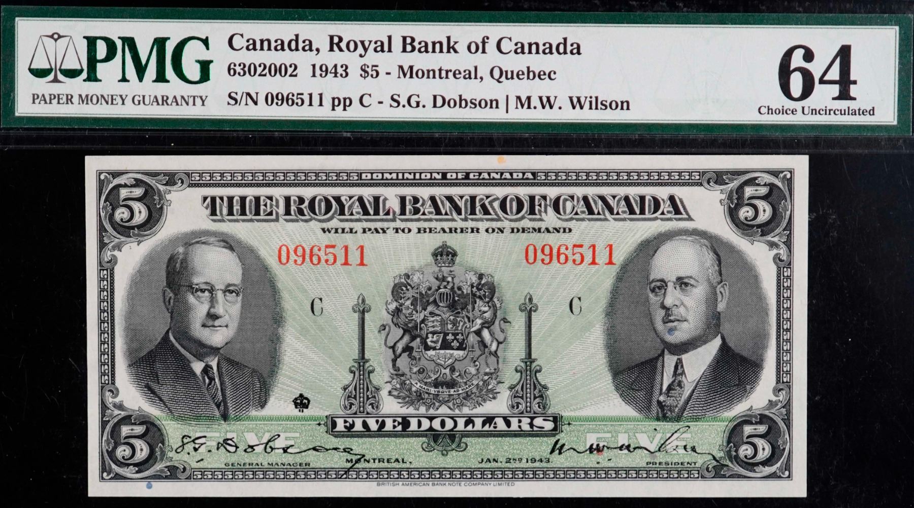 The Royal Bank of Canada; 1943 $5 #096511 CH-630-20-02, PMG Very Choice Uncirculated-64. A near Gem example with nice and vibrant colours.