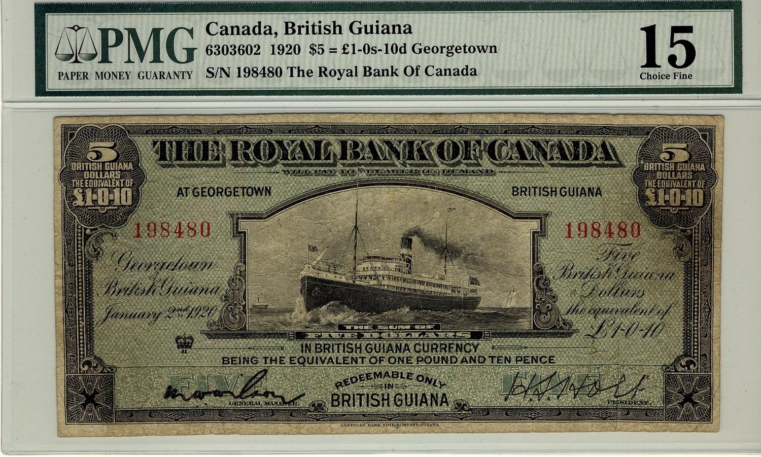 The Royal Bank of Canada, British Guiana, 1920 $5=£1-0s-10d #198480, CH-630-36-02, PMG CH F15. Only 10 known.