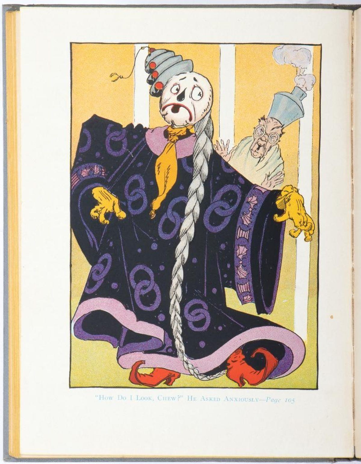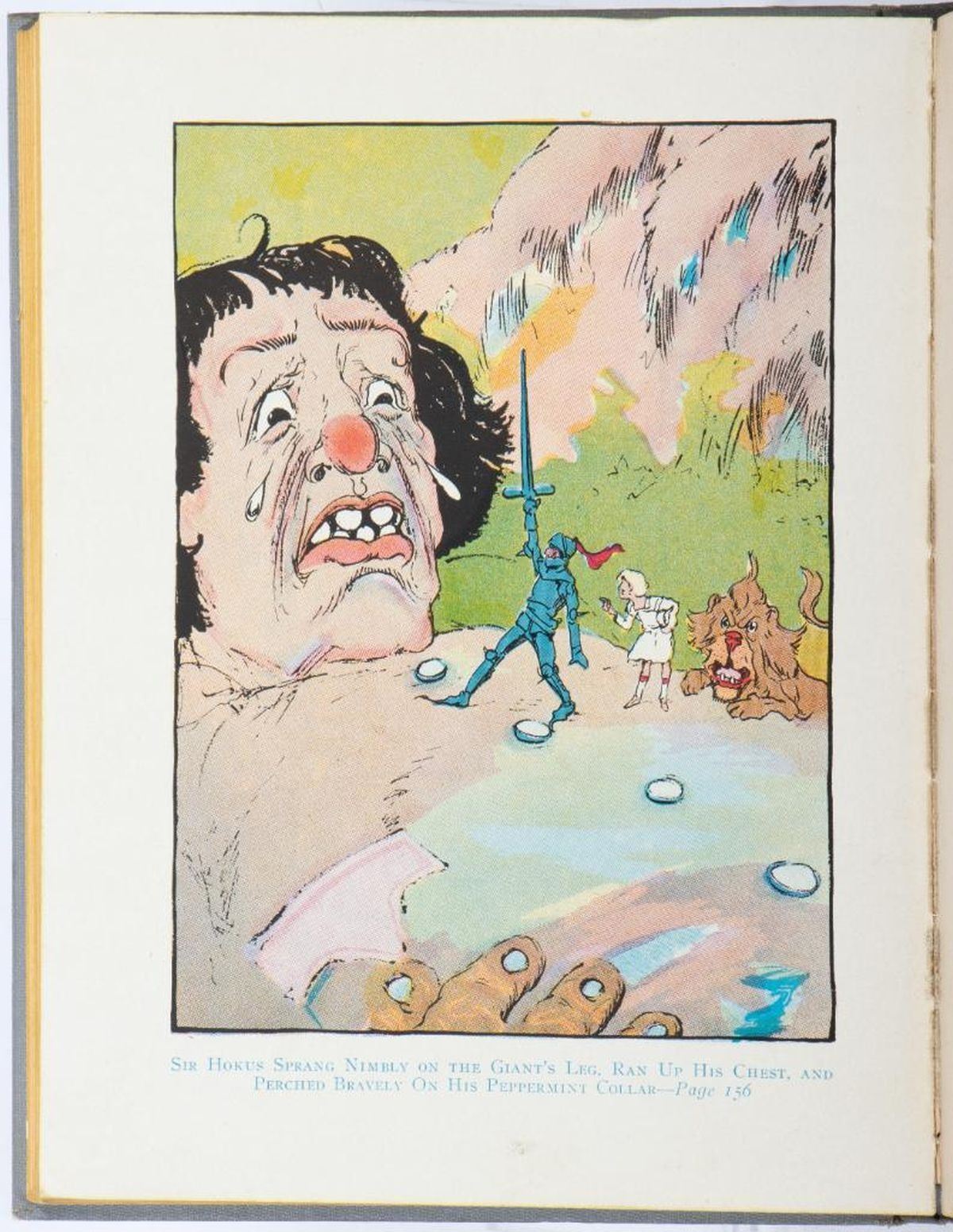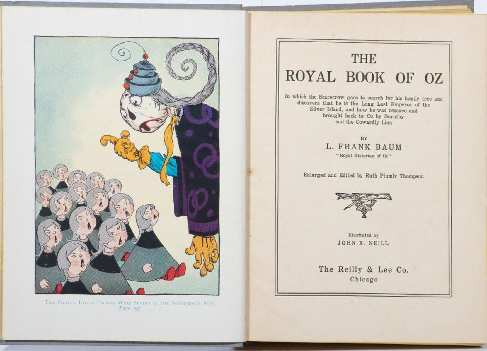 The Royal Book of Oz by Ruth Plumly Thompson, illustrated by John R. Neill. Thompsons first Oz book accredited to Baum edited by Thompson. Reilly & Lee 1921 first edition, later state with scarecrow€ spelled correctly on color plate facing page 255. Illustrated with 12 color plates and numerous black & white drawings by John R. Neill. Original gray/brown cloth, pictorial cover label; black & white pictorial endpapers. Very good to fine copy. Inscription on ownership page.