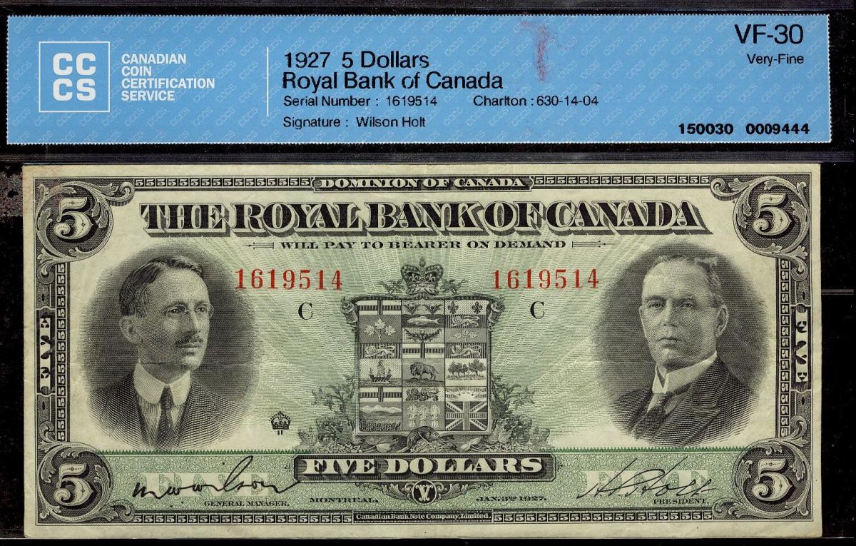 The Royal bank of Canada 1927 $5 #1619514 CH-630-14-04 CCCS VF30