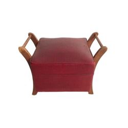 Mini ottoman with wooden handles. Covered in vinyl material with two small rips. 21"x17"x17"