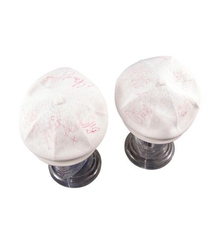The Rubettes Signed Photo And Caps - Tom Hanks starred, wrote and directed a delightful film called "That Thing You Do!", about a band that is basically a "one hit wonder" in the 1960's, something that always fascinated him. There were plenty of American bands for his inspiration, as well as one major English band, called "The Rubettes". Just when "glam rock" was peeking, the Rubettes showed up singing "doo-wop" type songs, wearing what became their trademark white suits and Kangol "Gatsby" style cloth caps. Talk about show-biz night and day! Not to mention a bit of "fresh air" from what everyone was hearing and looking at. Their one great hit was "Sugar Baby Love", which immediately that zoomed up the charts both in the United Kingdom and the United States. They are still beloved to this day. This is a rare Rubettes collectable set. It includes a color photo signed by the group: Alan Williams, John Richardson, Mick Clarke and Mark Hale, as well as two of their iconic white caps, also signed by the group.