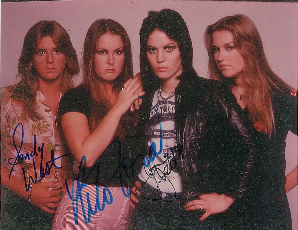 Color glossy 10 x 8 photo of the band, signed in black felt tip by Joan Jett and in blue felt tip by Lita Ford and Sandy West. In fine condition, with some light contrast to Ford’s signature.