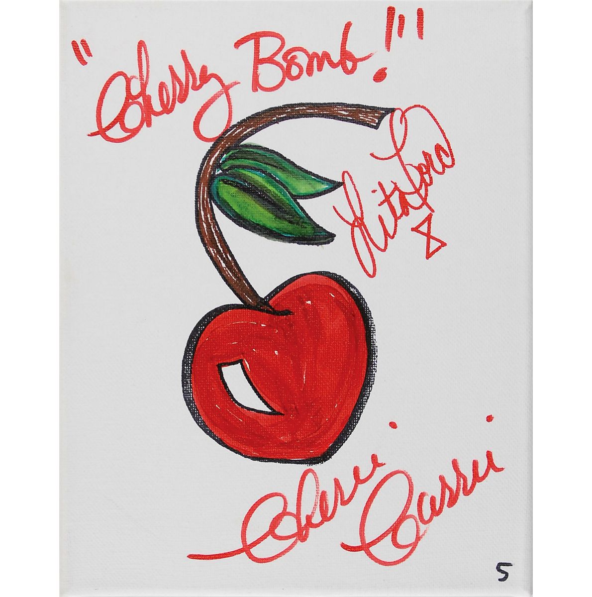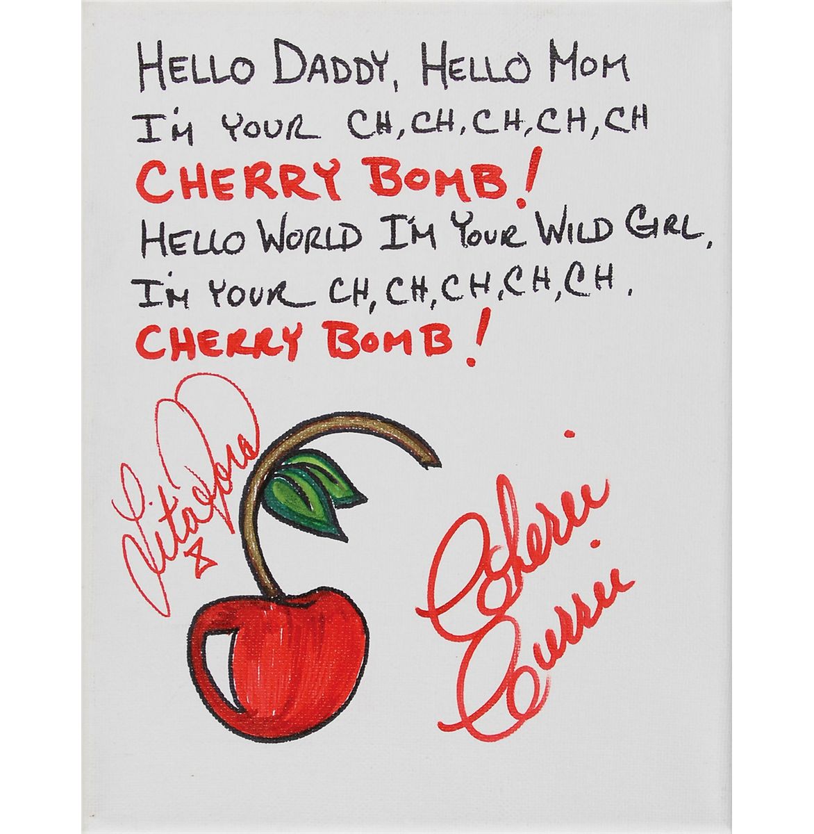 Two pieces of original artwork by Cherie Currie on individual pieces of stretched 8 x 10 canvas, both signed by Cherie Currie and Lita Ford. Both depict cherries, with one headed “Cherry Bomb!” and one with some of the lyrics of the classic song. In overall fine condition.
