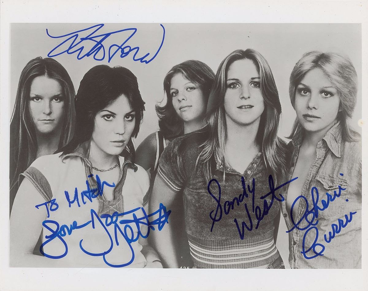 Glossy 10 x 8 photo of The Runaways, signed and inscribed in blue felt tip, “To Mitch, Joan Jett,” “Lita Ford,” “Cherie Currie,” and “Sandy West.” In fine condition, with some mild feathering to inscription and a spot of soiling to right edge.